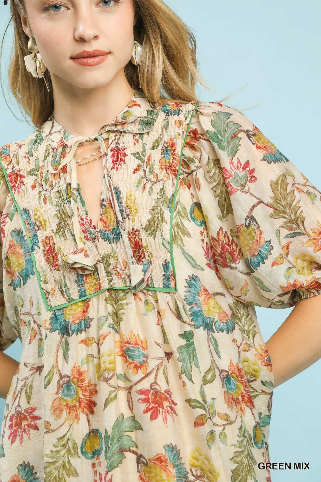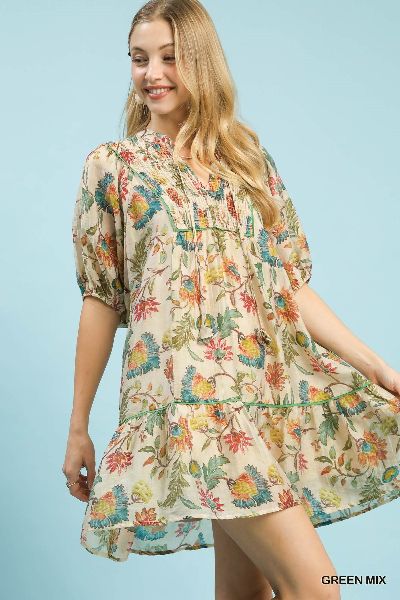 Soft, feminine, and effortlessly pretty—this floral babydoll dress is the perfect blend of comfort and charm. Crafted from breathable Tencel, it drapes beautifully and feels lightweight against the skin. The V-neckline features delicate pintuck detailing, while the short puff sleeves add a touch of volume and romantic flair. A tiered skirt with subtle ruffles creates movement and flow, making this dress an easy choice for brunch, showers, or warm-weather outings.