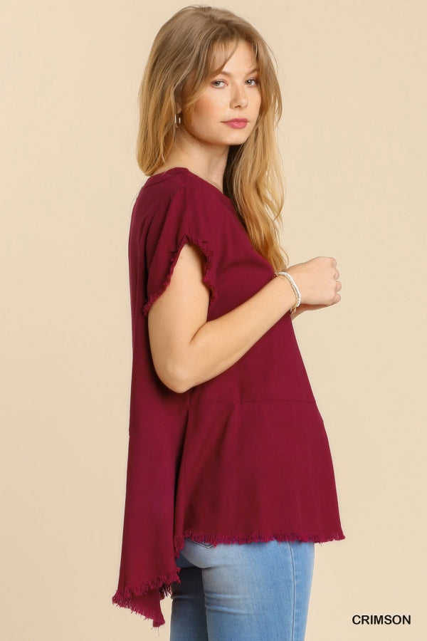 Linen Blend Round Neck Short Sleeve Top with Chest Pocket and Raw Edged Hem