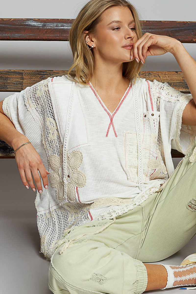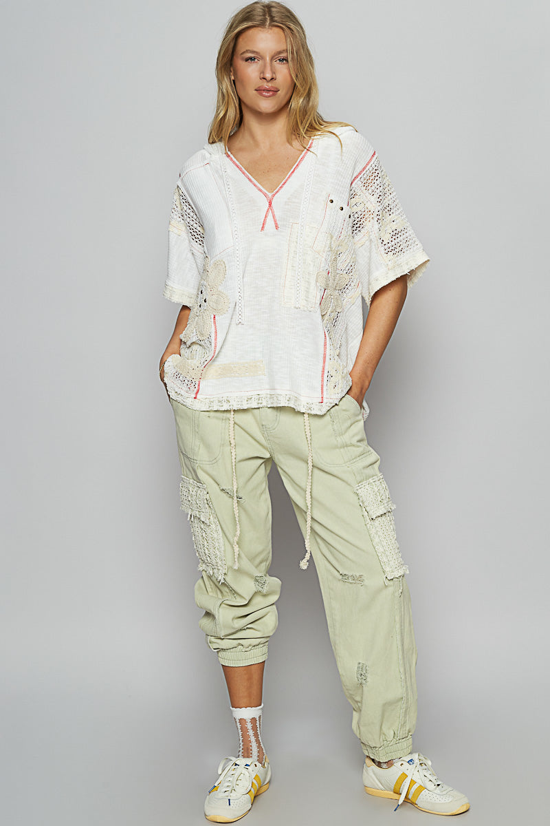 Slip into sun-washed charm with the Sedona Bloom Hoodie Top, a relaxed-fit piece that blends vintage soul with modern comfort. Featuring a V-neckline, patchwork lace details, raw edge finishes, and soft floral crochet appliqués, this top is designed for laid-back days with an artistic twist. Lightweight ribbed fabric keeps it breathable, while a cozy hood adds just the right touch of casual cool.